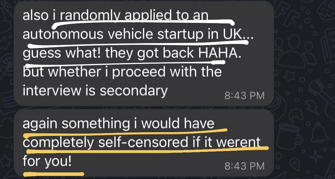 ✅ Realized that the reason he wasn't getting any job offers previously was because he kept going for roles that sounded safe and prestigious, but were not what he was innately interested in