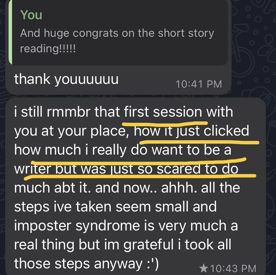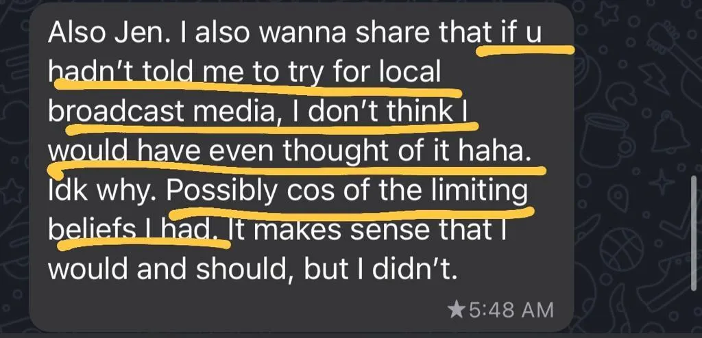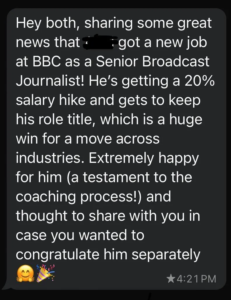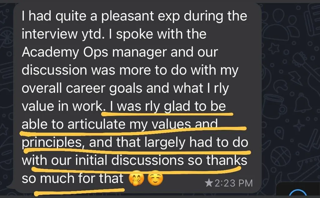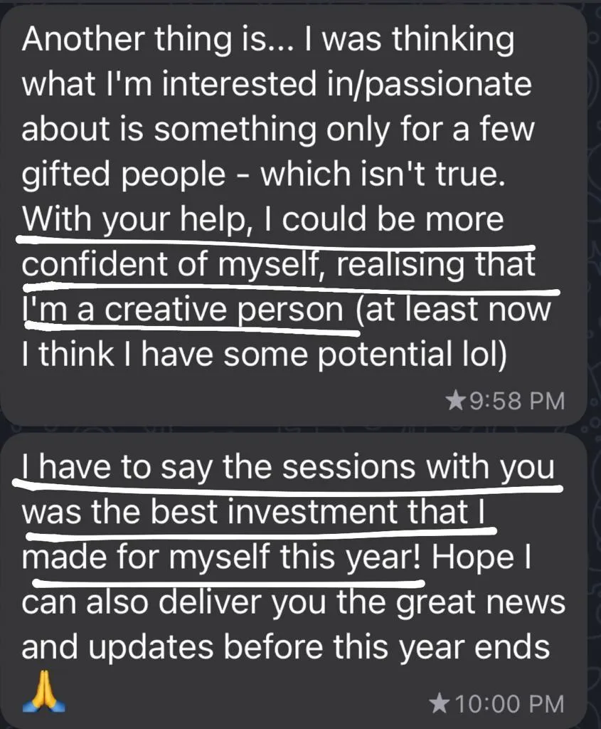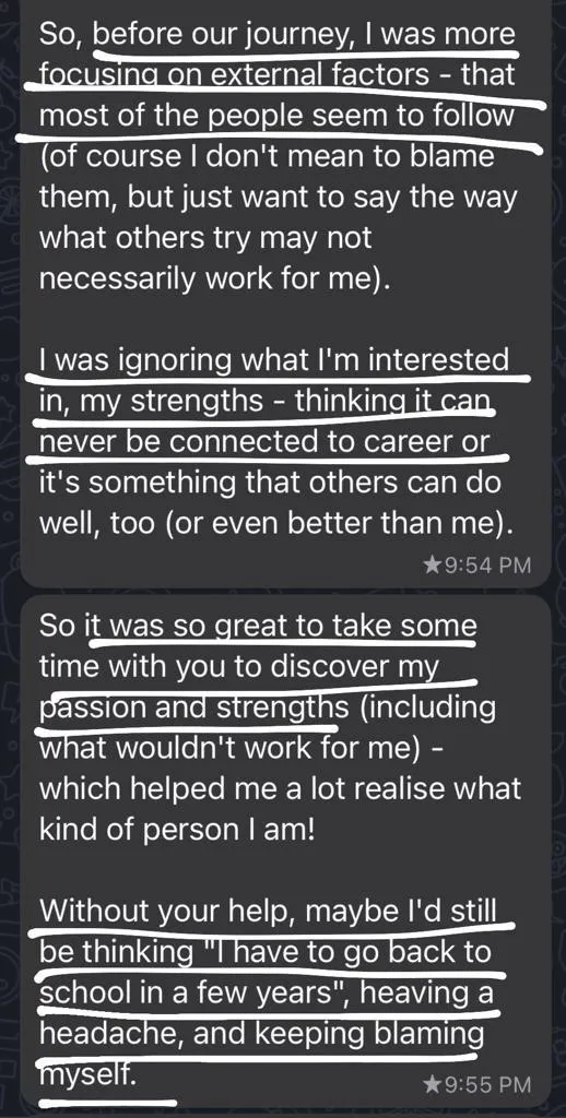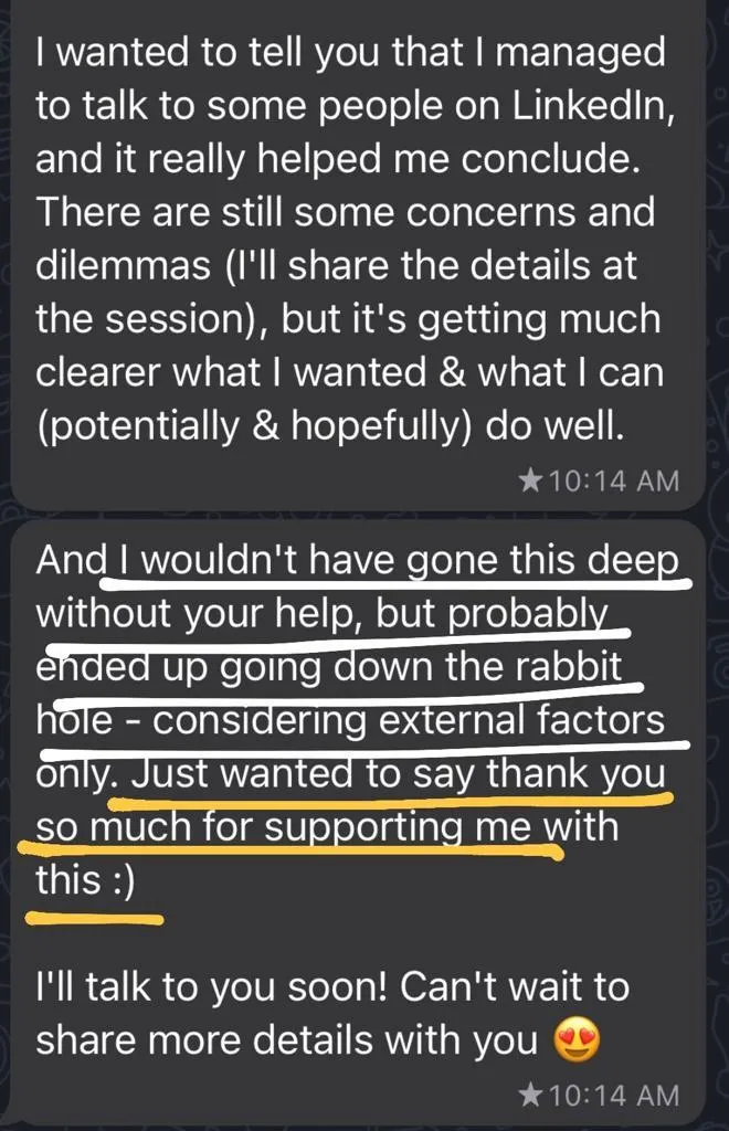 I approached many career counsellors and sat through several “introductory” sessions to listen to their pitches. Jen’s was different, I needed someone who can understand my struggles as she genuinely shared about hers. That was the moment i thought she will be the right fit as this was going to be several months long guidance, so it's important we needed to click.