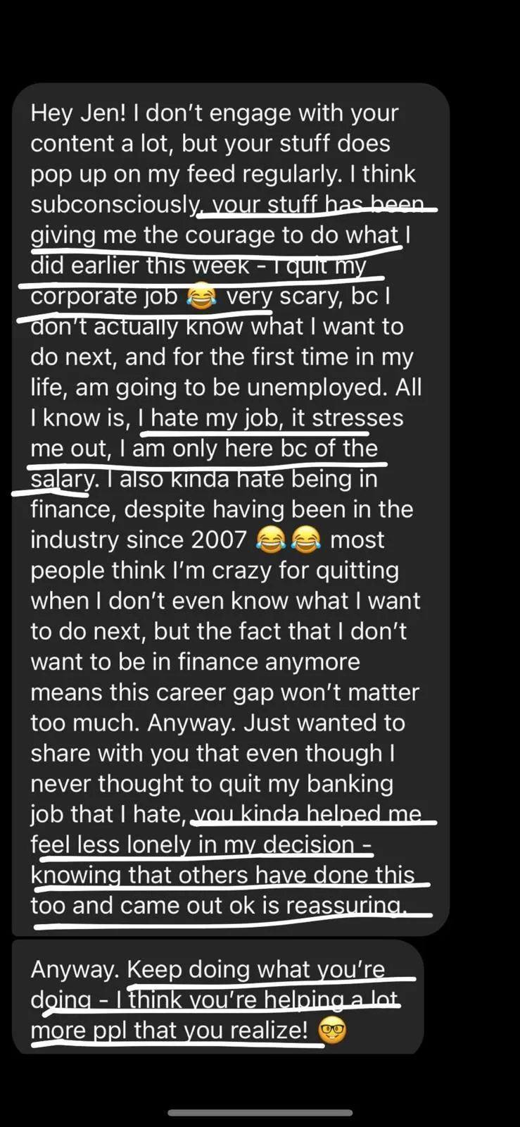 I’ve been feeling more inspired and confident in my decision to leave corporate with Jen’s support.
